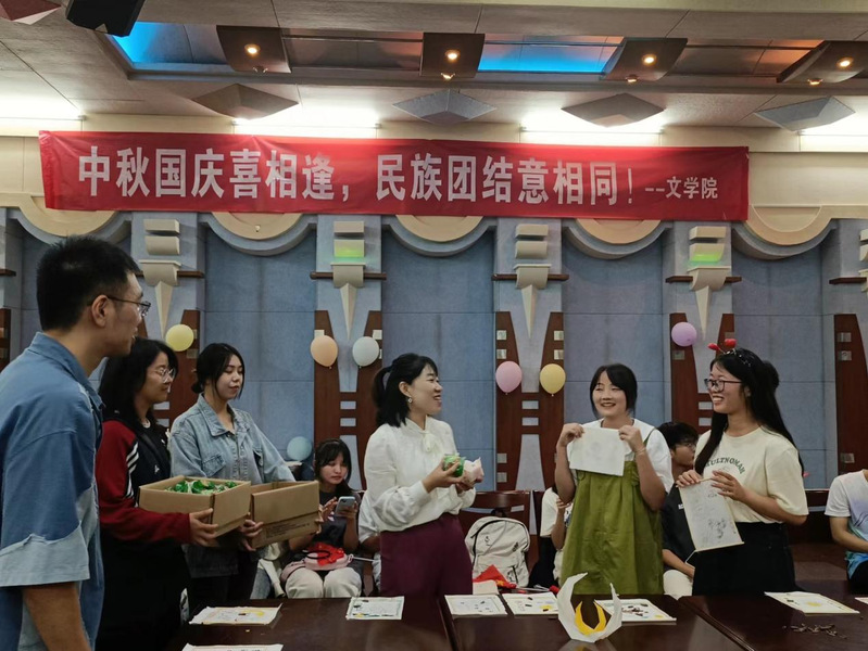 在文学院“中秋国庆喜相逢,民族团结意相同”民族团结系列活动的现场,同学们感受着浓厚的中华传统文化,以别样的方式书写团结新故事,传播民族团结进步正能量。