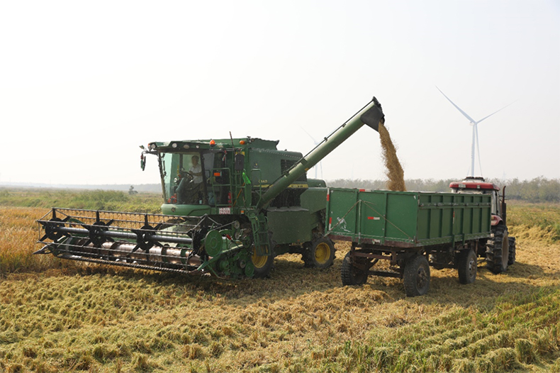 深秋的东台沿海滩涂,金灿灿的水稻和红彤彤的盐地碱蓬将大地点缀的色彩斑斓。近日,在江苏沿海开发(东台)公司条北现代农业示范基地条北二垦区,两台大型联合收割机正在对试验田种植的耐盐碱水稻品种进行收割。这是由伟德官网湿地学院、江苏滩涂生物与农业协同创新中心盐碱地改良团队攻关的“滨海重盐土高速高产高效改良技术创新与集成试验示范项目“实产验收现场。江苏省农业科学研究院陈留根研究员担任验收组组长。