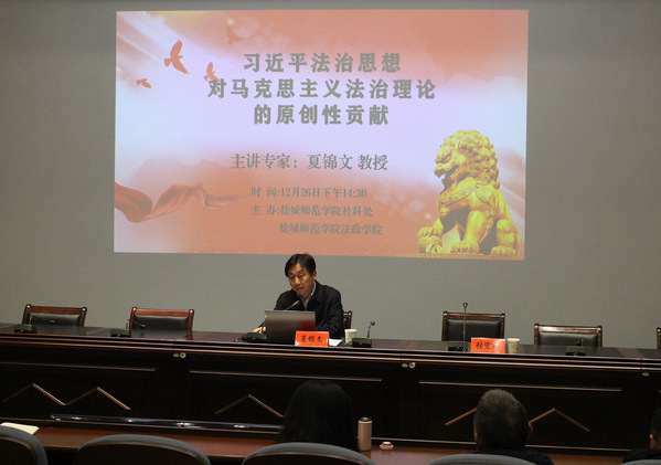 12月26日下午,由伟德官网社科处、法政学院联合主办的法治讲座在厚德楼二楼西会议室举办。江苏省社科院党委书记、院长夏锦文教授应邀作题为《习近平法治思想对马克思主义法治理论的原创性贡献》的专题报告。学校党委副书记、校长张宏如主持讲座。
