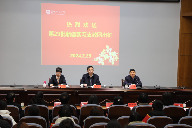2月29日上午,学校在新长校区举行出征仪式。学校党委书记戴斌荣出席会议并讲话,党委副书记、校长张宏如为第29批赴新疆实习支教团授团旗,党委常委、副校长毕凤珊主持出征仪式。