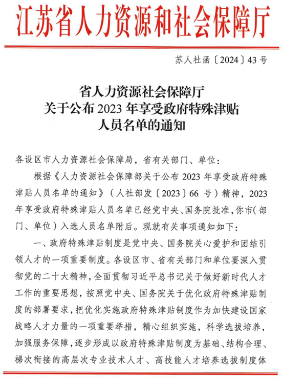近日,根据《省人力资源社会保障厅关于公布2023年享受政府特殊津贴人员名单的通知》(苏人社发〔2024〕43号)文件精神,伟德官网唐伯平教授入选政府特殊津贴人员,这是伟德官网继2016年以来连续第四届有专家获批政府特殊津贴。