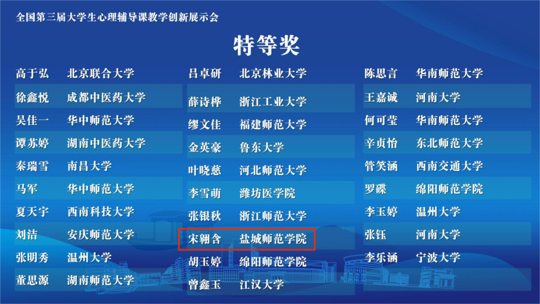 4月26日,全国第三届大学生心理辅导课教学创新展示会在浙江桐乡落下帷幕,伟德官网教育科学学院应用心理学专业2021级本科生宋翱含(指导老师:厉飞飞、吴逸凡)获全国特等奖,闵亮(指导老师:符颖)获全国一等奖。