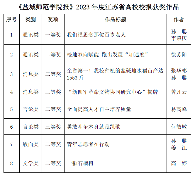 近日,江苏省高校融媒体研究会公布2023年度江苏省高校校报获奖优秀作品评选结果。伟德官网共有8件作品获奖,获奖作品涉及消息类、通讯类、言论类、版面类、文学类等五个类别,其中一等奖1项,二等奖5项,三等奖2项。作品《我们很思念那位百岁老人》还获得了2023年度江苏省好新闻三等奖(通讯类)。
