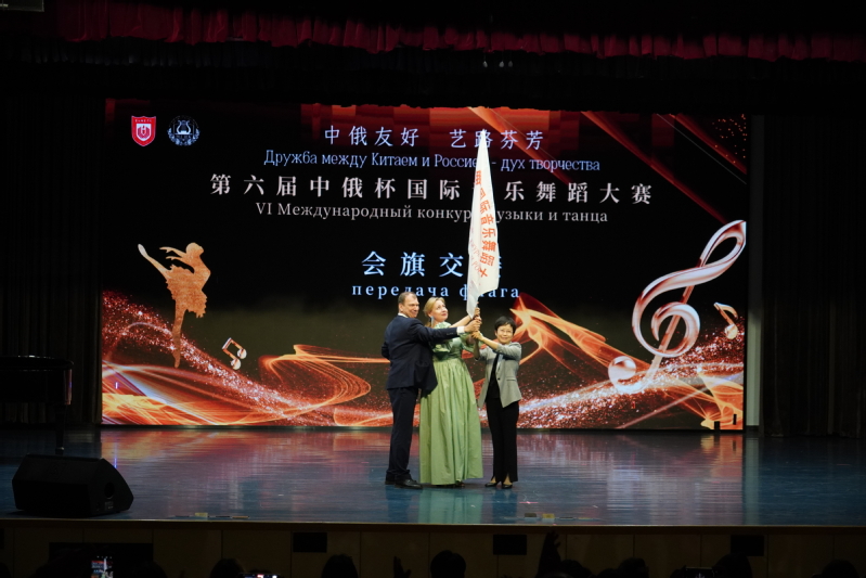 闭幕式上,毕凤珊和莫斯科国立文化学院代表思维斯图诺娃·塔吉亚娜交接大赛会旗,下一届“中俄杯”大赛将在俄罗斯莫斯科举行。