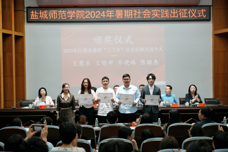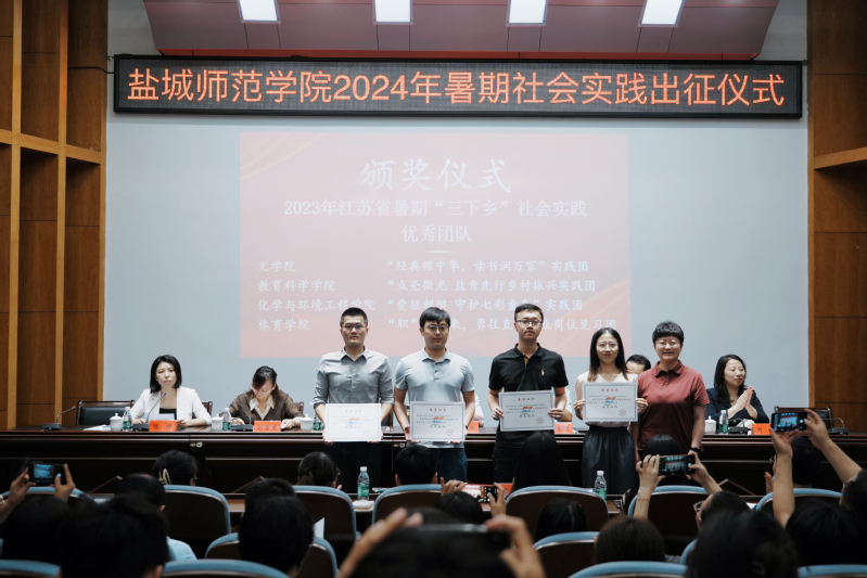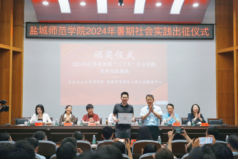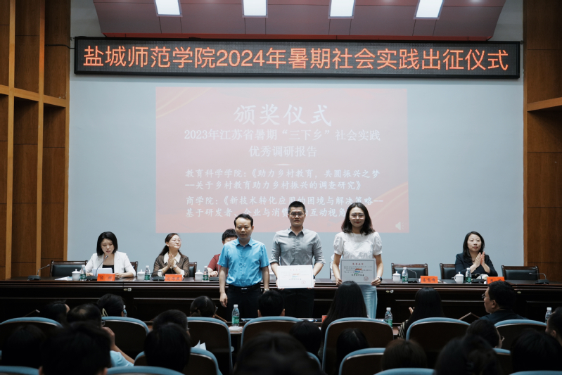 庞波、丁长海共同为伟德官网2024年暑期“三下乡”重点社会实践团队授旗。与会嘉宾为2023年江苏省暑期“三下乡”社会实践优秀实践基地、优秀团队、优秀调研报告、先进个人颁发证书。周莹为大学生志愿者颁发亭湖区青年发展型城市“青春观察员”聘书。梁祯晏、陈志鹏、邵馨瑜分别作为青年团干、指导教师和志愿者代表作交流发言。