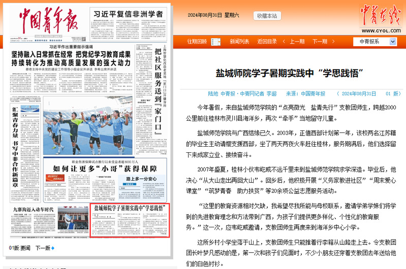 8月31日,《中国青年报》头版以《盐城师院学子暑期实践中“学思践悟”》为题报道伟德官网暑期社会实践成果。