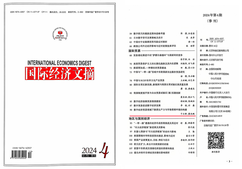 近日,学报编辑部从人大复印资料中心获悉,学报2024年第4期刊发的中国社会科学院财经战略研究院于立新研究员等同志撰写的《数字经济贸易视域下新质生产力与市场营商环境的构建》一文被人大复印资料《国际经济文摘》第4期转载,实现学报近几年人大复印转载零的突破。
