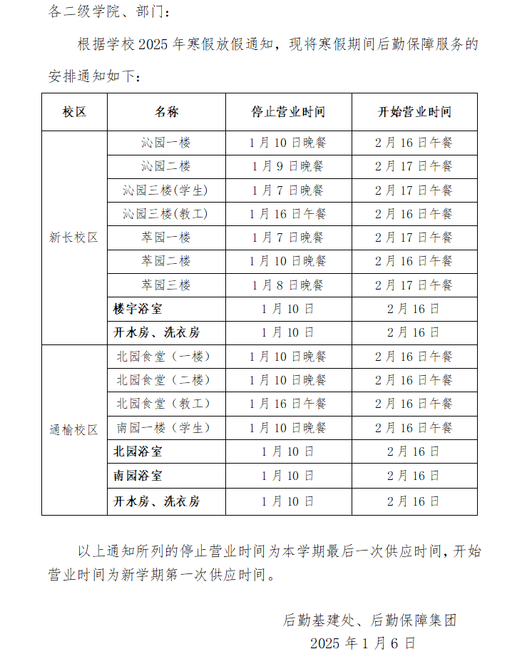 关于2025年寒假后勤保障服务安排的通知