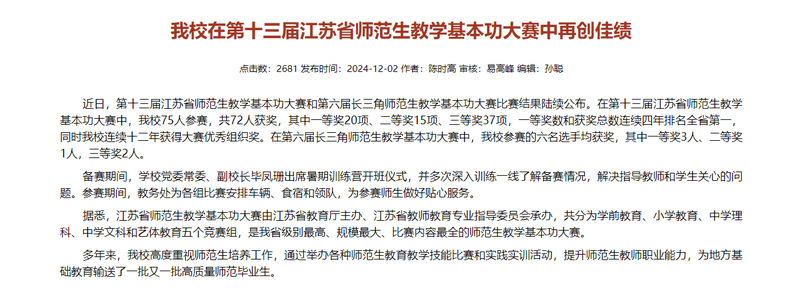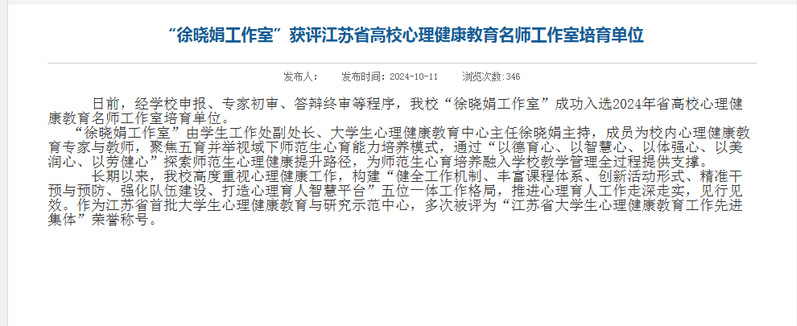 推进网络思政工作中心建设,深化“一站式”学生社区建设,获批省高校思想政治工作质量提升工程建设项目2项、“信仰公开课”省级精品课1项、省高校网络教育优秀作品推选展示活动奖项2项、省高校辅导员年度人物提名奖1项、省高校百校万名团干部思政技能大比武奖项6项、全国大学生讲思政课展示活动本科组奖项1项,“徐晓娟工作室”获评省高校心理健康教育名师工作室。教师通过遴选代表省委教育工委参加江苏“学习达人”挑战赛并获团体赛冠军,网络评论培训暨实战比武获得省教育厅和省委网信办通报表扬,新闻作品获江苏省好新闻奖。