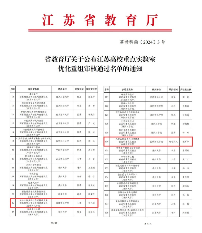 获教育部高校科研优秀成果奖(人文社会科学)4 项、其中一等奖2项,实现获奖层次、获奖数量的历史性“双突破”。新增国家级科研项目 20 项、省部级项目33项。获批海岸带资源环境演变与智能调控实验室、江苏省统计学习与智能识别工程研究中心2个省级科研平台;儿童认知发展与心理健康重点建设实验室重组升级为省高校重点实验室,滩涂生物多样性与可持续发展重点实验室重组升级为国家级重点实验室培育建设点。