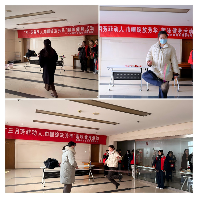 3月5日下午,外国语学院在通榆校区主楼举办“三月芳菲动人,巾帼绽放芳华”趣味健身活动,活动设置跳绳和踢毽子两个项目,既考验个人技巧,又充满趣味性。活动现场,女教师身轻如燕,绳子上下翻飞,五彩的毽子在空中划出优美的弧线,女教师灵活的身姿和娴熟的技巧赢得阵阵掌声。同学们还纷纷为女教师送上鲜花和美好祝福,表达了对女教职工辛勤付出的感谢。