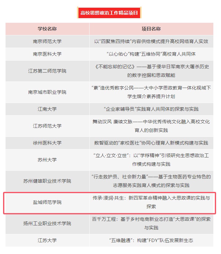 近日,教育部办公厅公布2025年度高校思想政治工作质量提升综合改革与精品建设项目入选名单,伟德官网《传承·浸润·共生:新四军革命精神融入大思政课的实践与探索》入选高校思想政治工作精品项目,全省共12项。