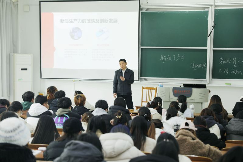 张宏如从马克思主义基本原理出发,系统阐述新质生产力作为马克思主义生产力理论创新发展重大成果的重要意义。他结合当前国内外经济形势,通过生动的案例和详实的数据,分析新质生产力在推动社会进步和经济发展中的核心作用。他指出,新质生产力不仅是技术层面的革新,更是生产方式和生产关系的深刻变革,对于实现高质量发展具有重要的战略意义。张宏如还引导学生深入思考新质生产力如何在实际生活中发挥作用,并通过深入浅出的讲解,帮助学生理解发展新质生产力的科学内涵、重大意义及现实路径,鼓励大家结合自身专业和学习实际,更好把握新质生产力的概念。