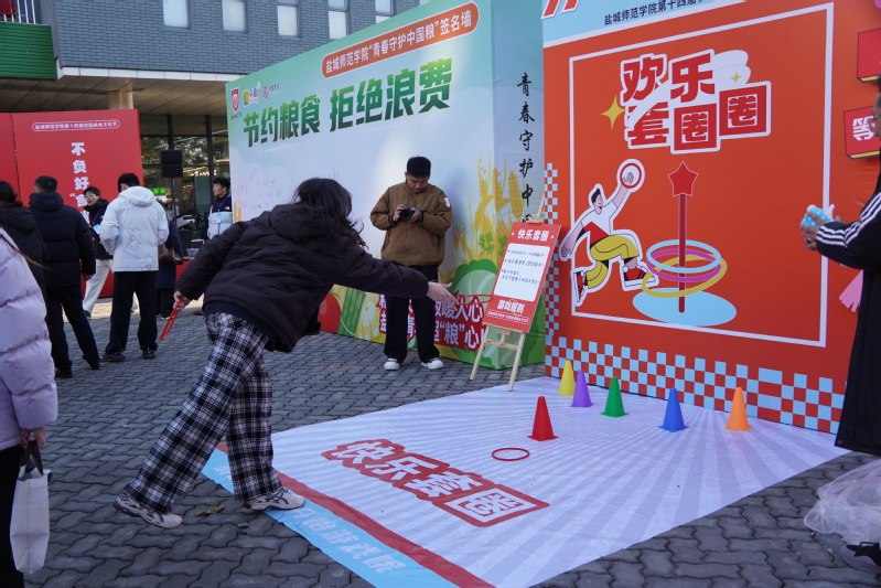 活动还设置了“欢乐套圈”“趣味投壶”“眼疾手快”“穿越火线”等游戏互动环节,师生们热情投入,欢声笑语此起彼伏。在两个校区设置的地特色美食广场齐聚了南北风味,各类小吃现场制售,香气四溢,吸引众多师生驻足品尝。美食节菜肴优惠销售与传统食品代加工销售活动让师生尽享实惠与便利。优质食材优惠销售专区特别增设响水县助农产品展销,在推广优质食材的同时,助力乡村振兴,彰显了活动的社会责任感。此外,超级蛋糕、小吃免费品尝活动也备受青睐,大家在分享中传递温暖与快乐。