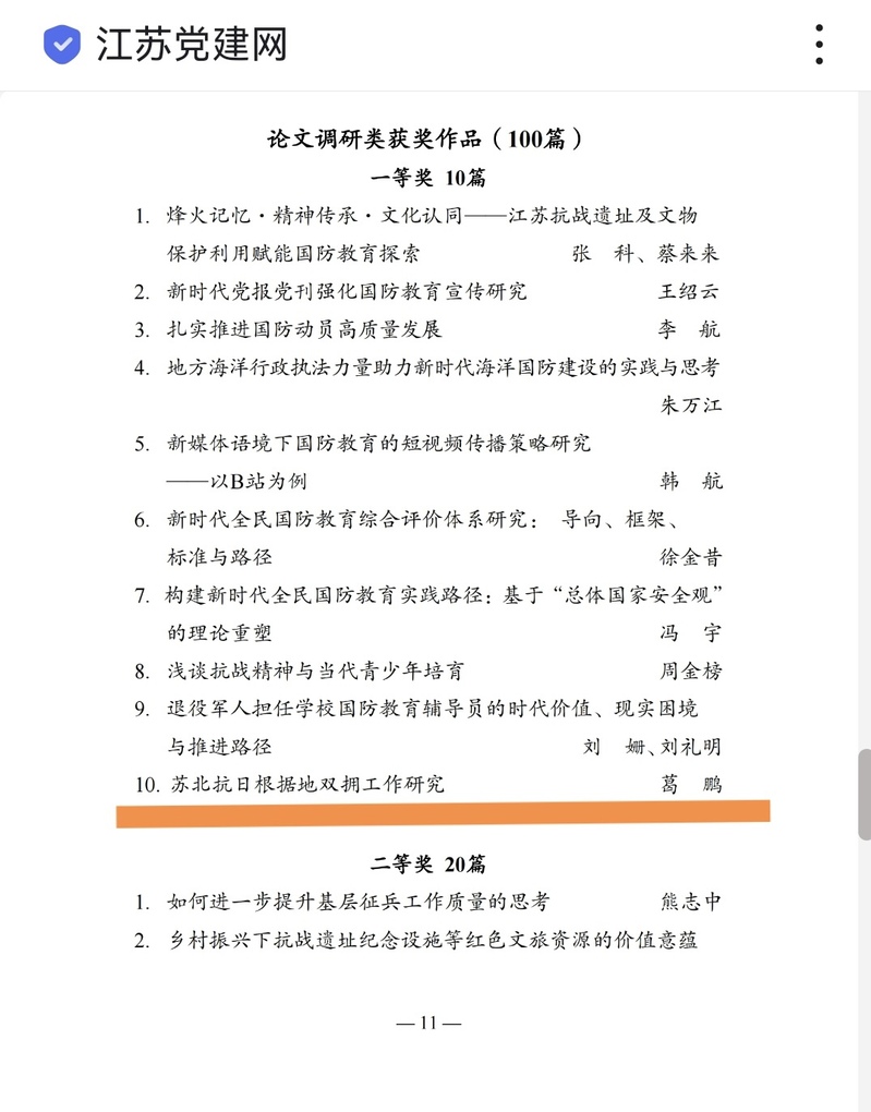 近日,由省委宣传部、省国防动员办公室、省教育厅、省退役军人事务厅、省军区政治工作局联合主办的“铭记历史 爱我国防”江苏省第二届全民国防教育主题征文大赛结果揭晓。伟德官网后勤保障部葛鹏老师撰写的论文《苏北抗日根据地双拥工作研究》荣获“论文调研类作品”一等奖。