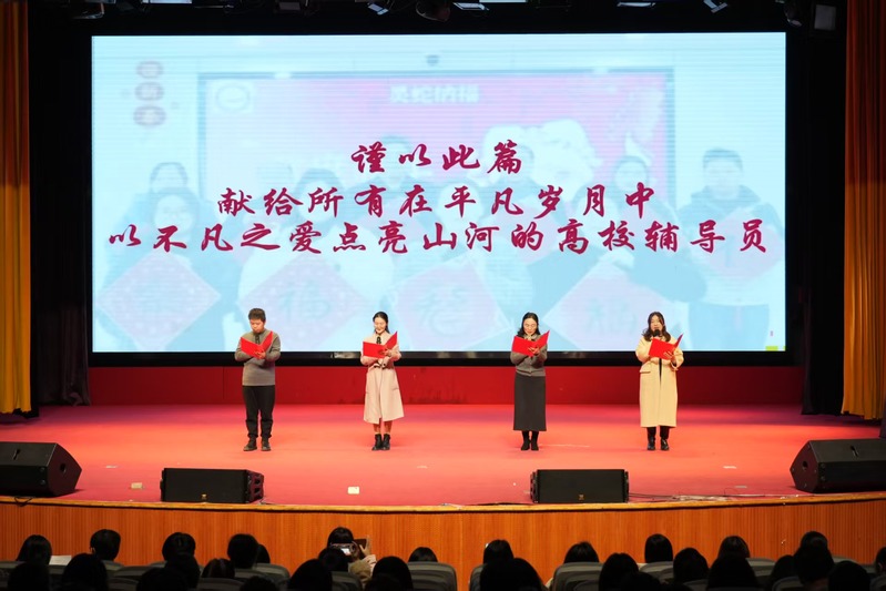 学校学生工作处、招生就业处、团委、保卫处、研究生处负责同志,各学院学生工作负责人、全体专职辅导员及部分学生代表欢聚一堂,共享这场属于辅导员队伍的视听盛宴与温情时刻。