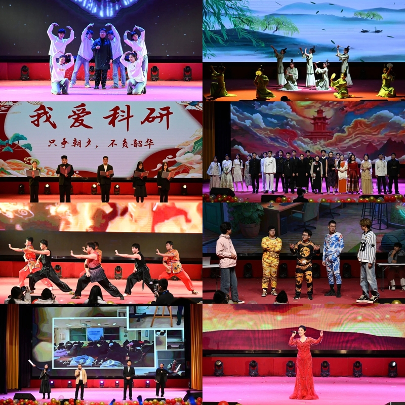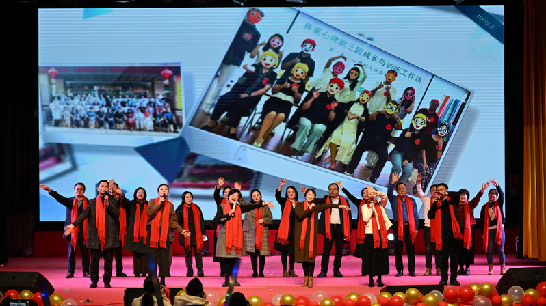 文艺演出高潮迭起、精彩纷呈。说唱《阳光开朗辅导员》以动感旋律展现出辅导员亦师亦友的青春形象,瞬间点燃现场气氛;舞蹈《清风徐来》舞姿轻盈、意蕴悠长,尽显国风韵味;伟德官网首届研究生演绎的朗诵《我爱科研》,字里行间满是对科学的炽热追求,道出科研人的坚守与浪漫;师生同台的走秀《国风雅韵》融古典雅致与当代风姿于一体,彰显传统美学神韵;武术《武魂贺新年》招式刚劲有力,展现体院学子的意气风发与中华武魂的热血豪情;小品《花园网吧》以幽默诙谐的校园故事,传递青春成长的人生哲理;歌曲《再回首》的悠扬旋律唤起青春记忆,《国旗之恋》的铿锵曲调抒发炽烈家国情怀。盐师学工人合唱《送你一朵小红花》温情亮相,手心撰画的小红花与柔和灯光相映成趣。歌声里,既有对学工人员躬耕育人、默默守护的感恩,对学子在逐梦路上勇敢前行的赞许,也饱含着师生同心、守望相助的深厚情谊。现场同学还自发为现场所有领导、老师献上一枝花语为感恩的火红康乃馨。