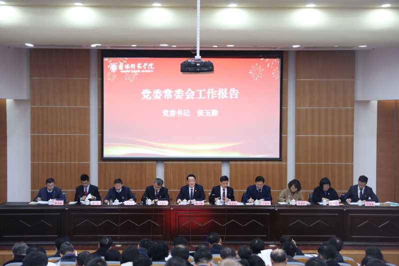 张玉勤代表学校党委作《鼓足干劲抓改革 全面发力开好局 砥砺奋进谱写学校高质量发展新篇章》的工作报告。报告从始终坚持党的政治建设、整改整治见行见效、思想政治教育走深走实、意识形态安全稳定、基层党建提质增效、干部队伍建好建强、全面从严治党、党建引领充分有力等方面全面总结2025年学校各项事业取得的新成效。