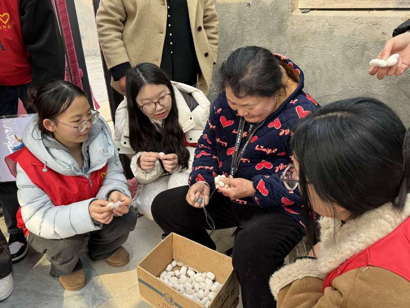 在老人们手把手指导下,青年志愿者拿起针线、布料与工具,认真学习制作当地特色的手工艺品。从穿针引线到装点成型,老人们的娴熟技艺与耐心传授,让青年志愿者们深刻感受到传统手工艺背后蕴含的匠心与温度。志愿者也发挥自身创意,围绕款式搭配、包装美化等细节,主动与老人交流想法,尝试将现代设计元素融入传统作品,让老手艺焕发新活力。现场气氛温馨融洽。