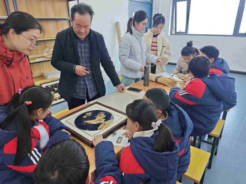 活动中,非遗传承人细致展示麦秆画的金色光泽与纹理塑造技巧,志愿者则配合手势与视觉化教程,帮助学生完成一幅幅麦秆拼贴作品。从骏马的鬃毛到公鸡的纹样,细腻的麦秆在指尖翻叠之间,逐渐化作生动图案。学生们专注的目光与绽放的笑颜,成为课堂最动人的画面。