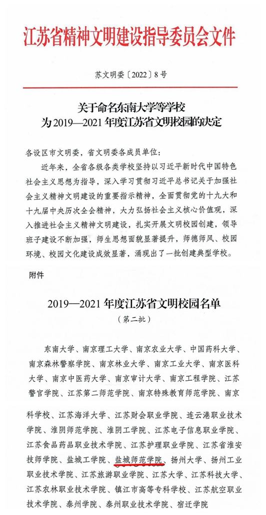 日前,江苏省精神文明建设指导委员会印发《关于命名东南大学等学校为2019—2021年度江苏省文明校园的决定》,伟德官网荣获2019-2021年度江苏省文明校园称号。近年来,伟德官网高度重视文明校园建设工作,将文明校园创建纳入学校事业发展规划,聚焦立德树人根本任务,围绕“思想道德建设好、领导班子建设好、教师队伍建设好、校园文化建设好、优美环境建设好、活动阵地建设好”“六个好”的创建标准扎实开展文明校园创建,学校各项事业呈现良...