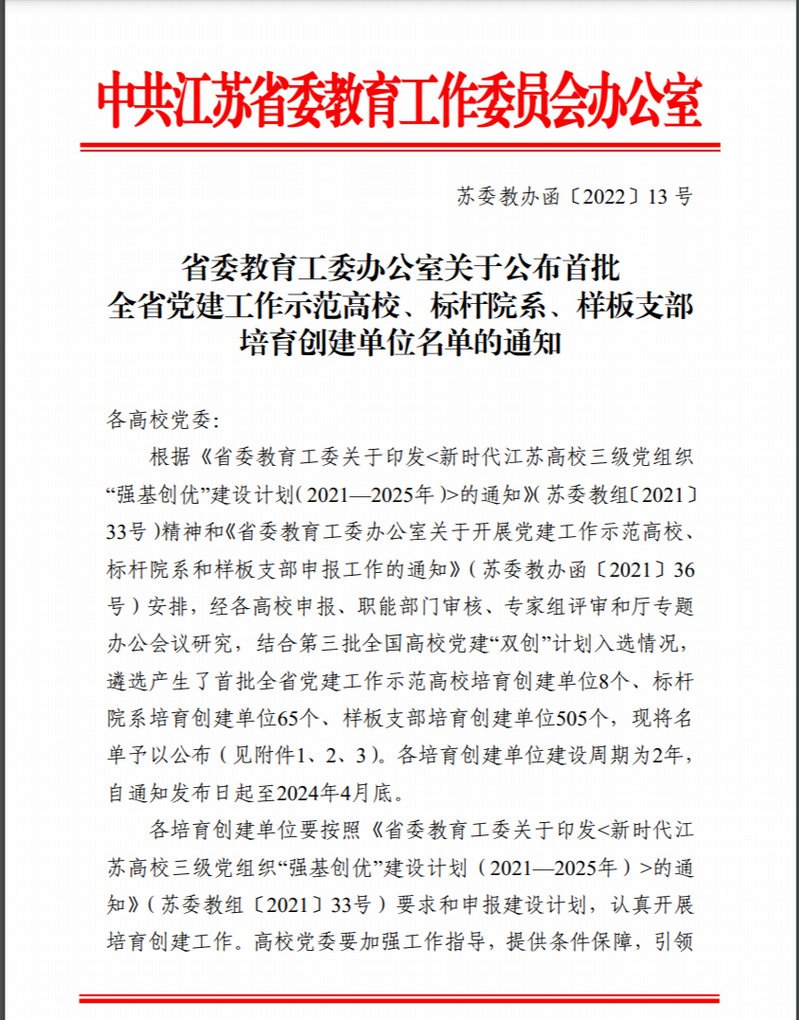 近日,江苏省委教育工委公布了首批全省党建工作示范高校、标杆院系、样板支部培育创建单位名单。伟德官网遴选报送的文学院党委入选首批“全省党建工作标杆院系”培育创建单位,机关第六党支部、信息工程学院学生第一党支部、历史与公共管理学院学生党支部等3个基层党支部入选首批“全省党建工作样板支部”培育创建单位。这是继法政学院教师第一党支部(现马克思主义学院教师第一党支部)、离退休教职工第七党支部、教育科学学院教工第...