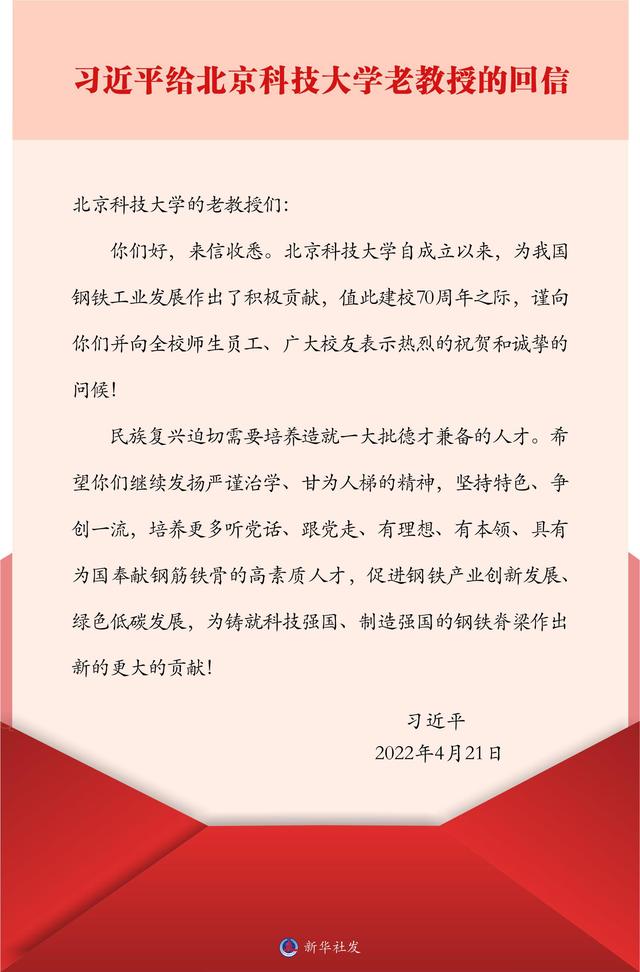 4月21日,习近平总书记给北京科技大学的老教授回信,对培养更多高素质人才,促进钢铁产业创新发展、绿色低碳发展提出殷切期望。习近平总书记在回信中强调,民族复兴迫切需要培养造就一大批德才兼备的人才,希望老教授们继续发扬严谨治学、甘为人梯的精神,坚持特色、争创一流,培养更多听党话、跟党走、有理想、有本领、具有为国奉献钢筋铁骨的高素质人才,促进钢铁产业创新发展、绿色低碳发展,为铸就科技强国、制造强国的钢铁脊...