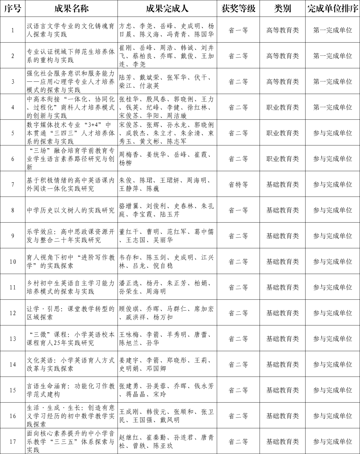 近日,江苏省教育厅发布《省教育厅关于公布2021年江苏省教学成果奖获奖项目的通知》苏教人〔2022〕4号),伟德官网组织申报的《汉语言文学专业的文化铸魂育人探索与实践》荣获一等奖,《专业认证视域下师范生培养体系的重构与实践》《强化社会服务意识和服务能力——应用心理学专业人才培养模式的探索与实践》《中高本衔接“一体化、协同化、过程化”商科人才培养模式的创新与实践》荣获二等奖,作为参与完成单位荣...