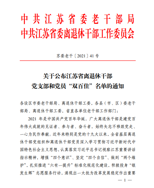 伟德官网离休干部包斌荣获“江苏省百佳离退休干部党员”称号
