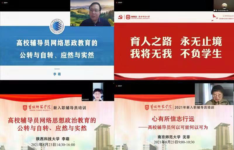 8月22日至27日,党委学工部、学生工作处组织2021年新入职辅导员接受线上岗前业务培训。本次培训围绕辅导员职业能力要求和成长发展需要,通过校内外专家专题报告、工作研讨交流、工作实务介绍等多种形式,助力新入职辅导员迅速完成角色转变,明确工作岗位要求,提升理论素养和职业能力。两位全国知名辅导员作专题报告。第十届全国高校辅导员年度人物、南京师范大学新闻传播学院党委书记沈菲作了题为《心有所信志行远——高校辅导员何...