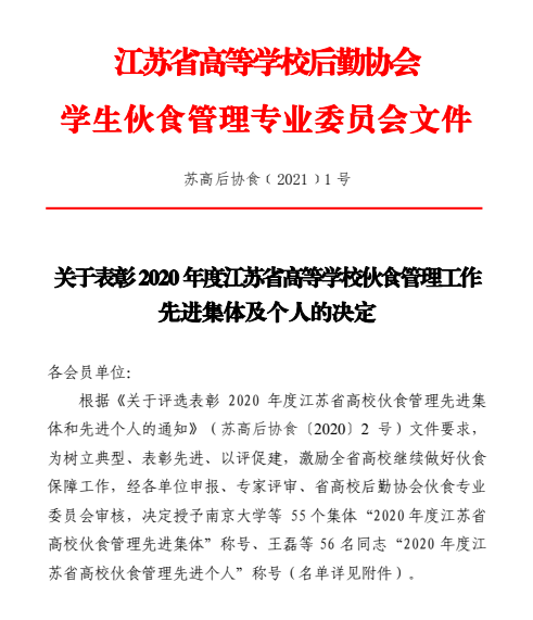 伟德官网获2020 年度江苏省高校伙食管理先进集体荣誉称号