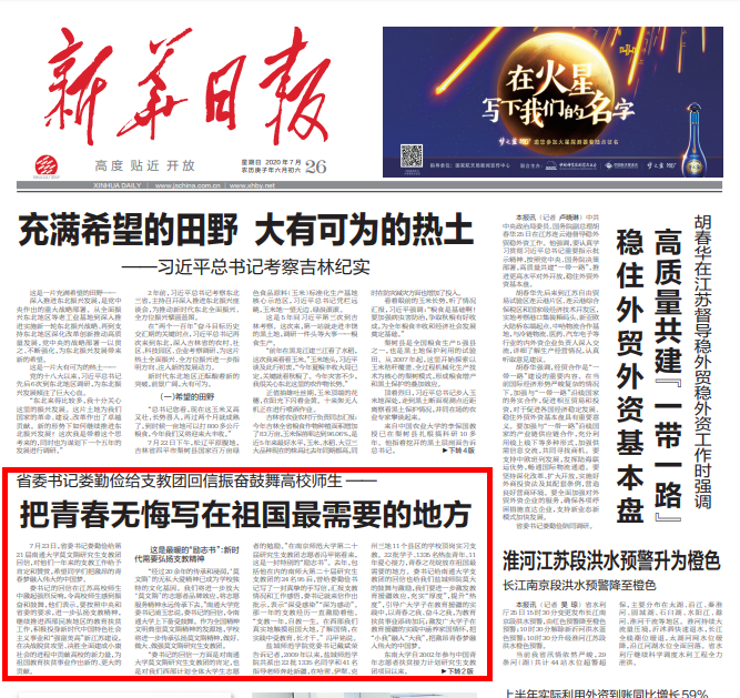 坐标网讯 7月26日,新华日报头版以《把青春无悔写在祖国最需要的地方》为题报道了江苏高校响应省委书记娄勤俭给第21届南通大学莫文隋研究生支教团回信精神,采访了有关高校开展支教工作的经验和做法。伟德官网党委书记戴斌荣接受了新华日报记者的采访。 采访内容如下: 伟德国际1949官网党委书记戴斌荣告诉记者,2009年以来,伟德国际1949官网共派出22批1335名同学和41名指导老师奔赴新疆,在哈密、伊犁、克州三地11...