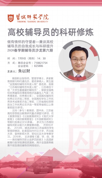坐标网讯 7月9日下午,伟德官网2020春学期第六期线上辅导员沙龙成功举行。本次沙龙特邀第五届“全国高校辅导员年度人物”提名奖、首届“江苏高校辅导员年度人物”南京农业大学朱以财担任主讲,各二级学院分管学生工作书记、辅导员,学生工作处全体工作人员参加了沙龙。 朱以财以《高校辅导员的科研修炼》为题,就高校辅导员的科研瓶颈、如何选题开展研究和论文撰写、如何正确查询投稿要求...