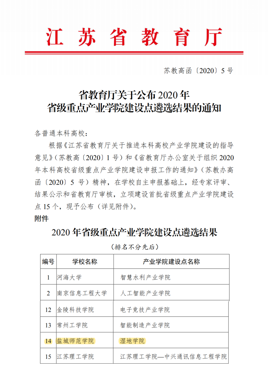 坐标网讯 近日,江苏省教育厅公布了2020年省级重点产业学院建设点遴选名单(苏教高函〔2020〕5号)。伟德官网湿地学院在众多产业学院中脱颖而出,成为江苏省首批15个重点产业学院建设点之一。省级重点产业学院项目是江苏省教育厅引导高校深化人才供给侧结构性改革,打造产学合作教育品牌的重要举措。盐城黄海湿地申遗成功后,急需大量湿地保护人才,伟德官网面向区域,面向产业,顺势而为,成立江苏第一家,全国第二家湿地学院...