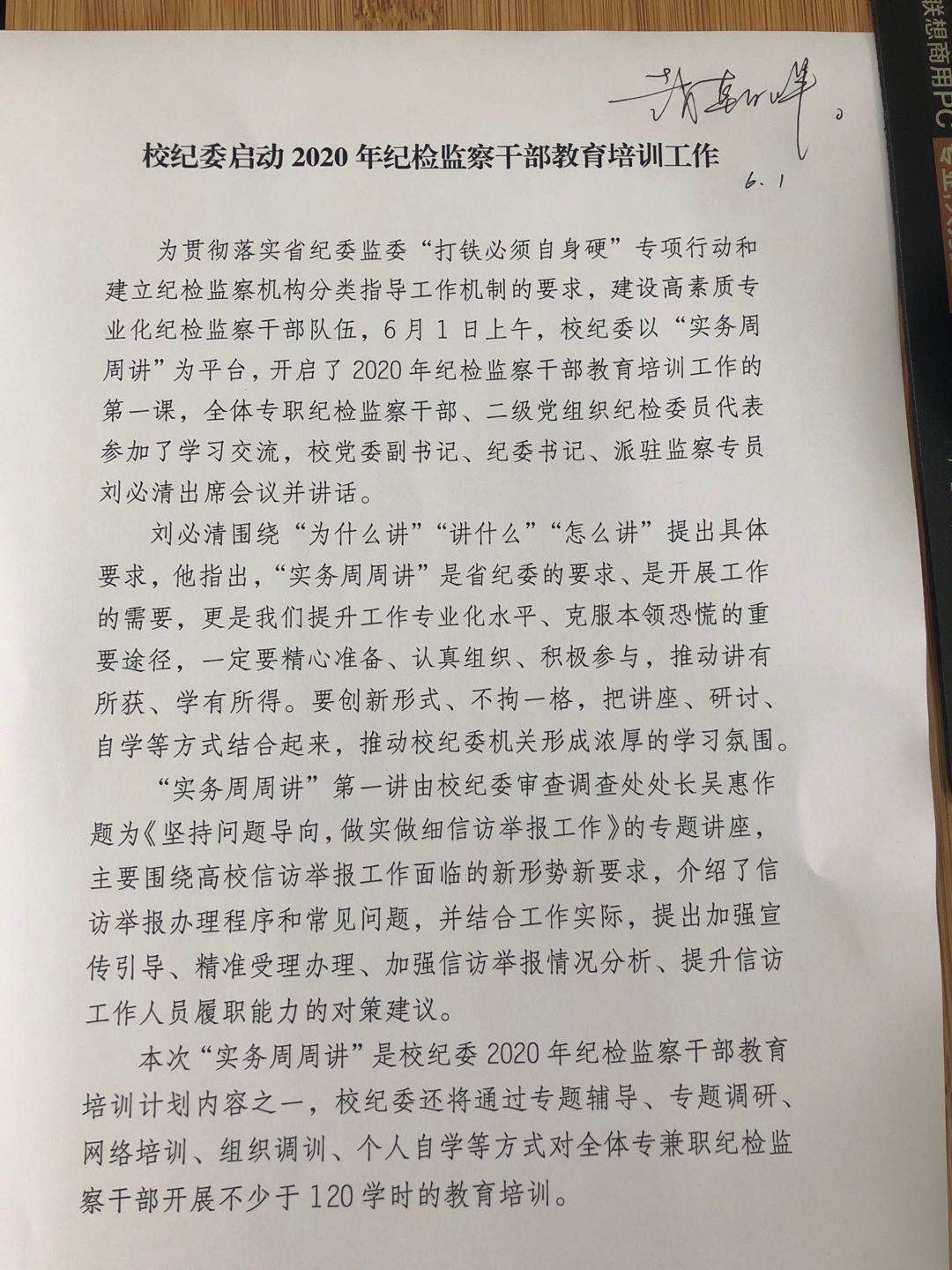 坐标网讯 为贯彻落实省纪委监委“打铁必须自身硬”专项行动和建立纪检监察机构分类指导工作机制的要求,建设高素质专业化纪检监察干部队伍,6月1日上午,校纪委以“实务周周讲”为平台,开启了2020年纪检监察干部教育培训工作的第一课,全体专职纪检监察干部、二级党组织纪检委员代表参加了学习交流,校党委副书记、纪委书记、派驻监察专员刘必清出席会议并讲话。刘必清围绕“为什么讲”“讲什么”“怎么讲”提出具体要求,...