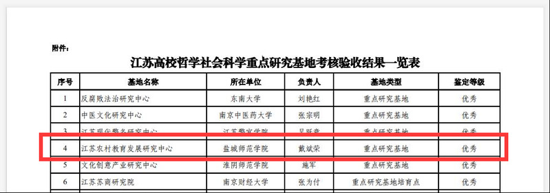 坐标网讯 近日,江苏省教育厅公布江苏高校哲学社会科学重点研究基地考核验收结果(苏教社政函〔2020〕7号),伟德官网江苏农村教育发展研究中心以“优秀”等级通过考核验收。此次共有15个省高校哲学社会科学重点研究基地通过验收,其中5个重点研究基地验收结果为优秀。与此同时,中心参加结项的3项江苏高校哲学社会科学研究重大项目和1项重点项目均顺利通过结项验收,其中戴斌荣教授主持的基地重大项目《农村学校教育现代化指标...