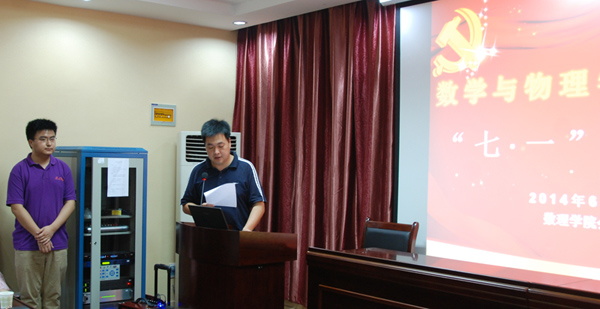 表彰大会在雄壮的国歌声中拉开帷幕,受党组织委托,李杰宣读了《数学与物理学院“七一”表彰决定》。刘治国为获得2013-2014年度校级先进基层党组织、优秀党员和优秀党务工作者颁奖,李宇凯为获得院级先进学生党支部和优秀学生党员颁奖。