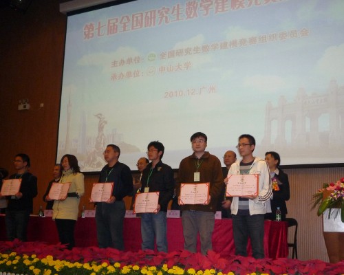 2010年9月17日,全国第七届研究生数学建模竞赛颁奖仪式在广州中山大学举行。德赢ac米兰官方合作院长刘安平教授、副院长彭放教授,校研工部李红丽副部长以及4名一等奖获得者参加此次活动。