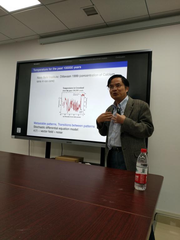 作为德赢ac米兰官方合作校庆67周年学术交流周名家论坛嘉宾同时作为“数理论坛”第114期嘉宾,段金桥教授做了一场“数据科学碰上动力系统:我们可以学到什么?”的精彩报告。段金桥教授首先从基因随机表达的现象和数据出发进入主题,然后介绍了大气科学以及全球温度变化的模式和数据,进一步引出了随机微分方程及其在地球科学问题中的应用,特别针对非高斯噪声体系,结合一个双稳态模型详细阐述了如何从数据出发进行模型的学习和优化,并寻找最大可能迁移轨道。段金桥教授的报告将数据科学和不确定性及非线性动力系统问题紧密联系在一起,并总结了若干地球科学、生命科学问题研究中的数学挑战。报告加深了大家对于应用数学的认识,启发了听众对于数据科学新的思考。