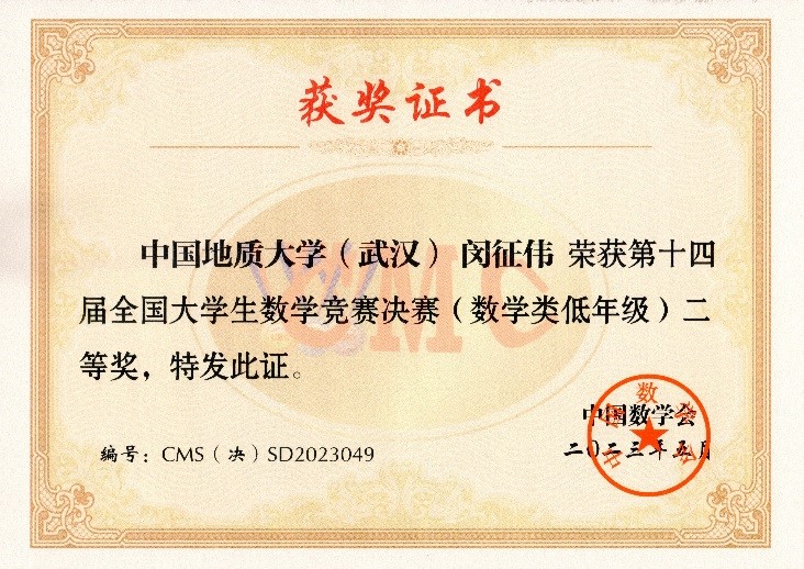 德赢官网121211班(数学菁英班)闵征伟、李嘉祥两位同学在第十四届全国大学生数学竞赛决赛中双双荣获二等奖。