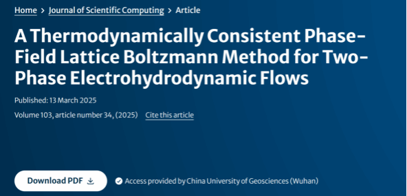 近日,我院2023级硕士研究生熊芳以第一作者身份在计算数学领域国际知名期刊《Jounal of Scientific Computing》上发表了题为”A thermodynamically consistent phase-field lattice Boltzmann method for two-phase electrohydrodynamic flows”的研究论文。该论文由德赢ac米兰官方合作(武汉)为第一通讯单位,汪垒副教授为论文的通讯作者,该论文得到了国家自然科学基金面上项目(NO.12472297)的资助。