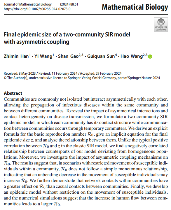 近日,德赢官网2021级博士生韩志敏以第一作者身份在国际生物数学主流期刊《Journal of Mathematical Biology》上发表题为“Final epidemic size of a two-community SIR model with asymmetric coupling”的学术论文。该论文第二作者为指导教师王毅副教授,通讯作者为加拿大数学生态学和流行病学跨学科实验室主任、阿尔伯塔大学数学与统计科学系王皓教授。