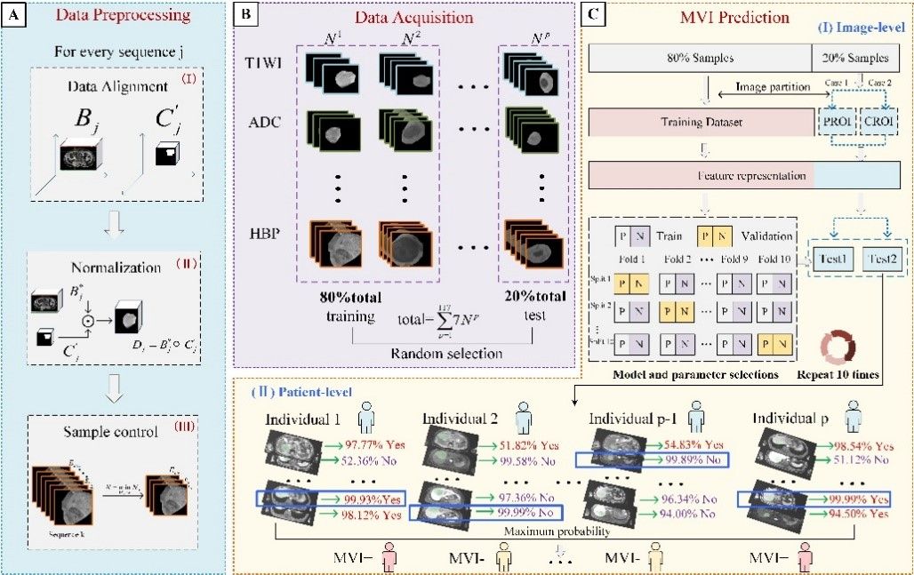 朱媛副教授团队利用深度学习技术和统计建模方法,提出了一种融合多模态核磁共振影像特征的肝癌MVI分类方法(图2),该方法通过深度融合算法进行图像信息的特征提取、融合、训练和分类,从而在图像水平和患者水平上提高了对肝脏肿瘤MVI的诊断准确性和效率。更值得一提的是,该方法在不完整ROI区域数据(PROI)和完整ROI数据(CROI)上均进行了评测,在不完整数据集上的优异的预测结果说明在没有专业医生勾勒ROI区域的情况下,此方法依然可以得到有指导意义的预测结果。此工作在肝脏肿瘤MVI诊断中的潜在应用价值,为肝脏肿瘤术前诊断提供了新的思路,为医生制定治疗方案提供了有价值的指导。