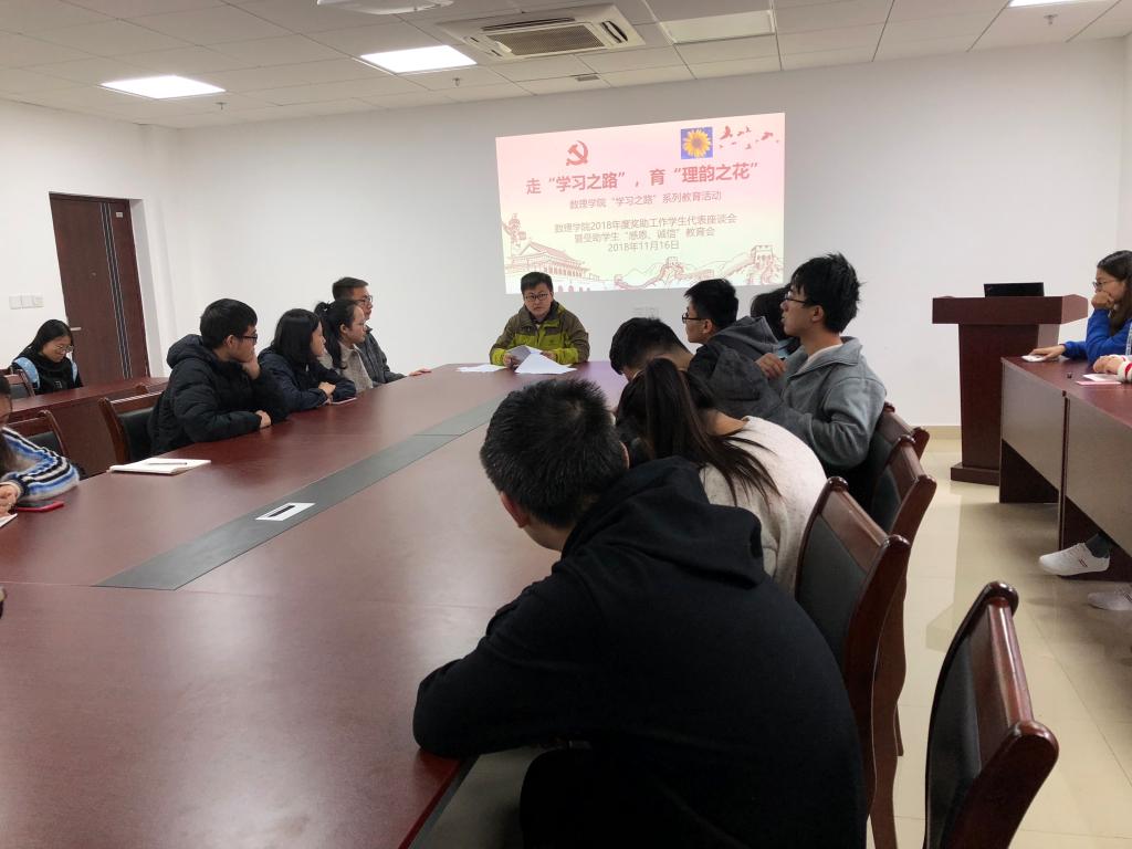 11月16日中午,德赢ac米兰官方合作2018年奖助工作学生代表座谈会暨受助学生“感恩、诚信”教育会在东区教学综合楼A1505会议室召开。2018年国家奖学金、国家励志奖学金获得者,各年级家庭经济困难学生代表参会,会议由辅导员孙宇涛老师主持。